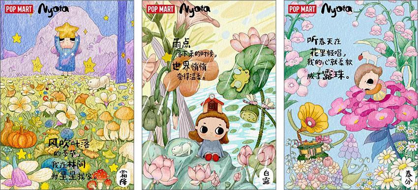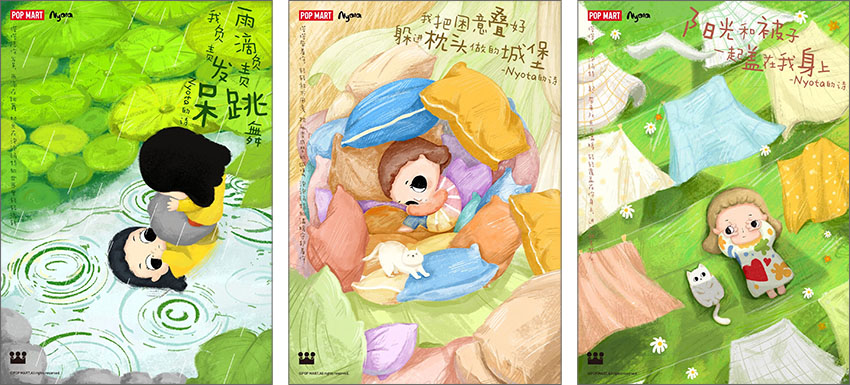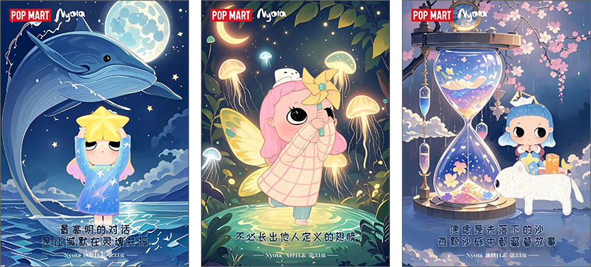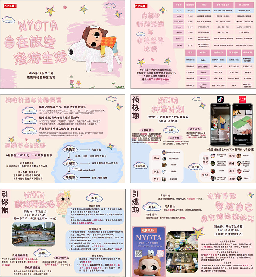POP MART(泡泡玛特),是成立于2010年的潮流文化娱乐品牌,旨在以“创造潮流,传递美好”为品牌使命,成为全球领先的潮流文化娱乐公司。Nyota(塔塔)是泡泡玛特旗下的原创IP形象,是一个容易被生活中美好事物打动的柔软女孩,也是一个INFP小蝴蝶。现在让我们一起来看看本届大广赛泡泡玛特命题的优秀获奖作品吧!