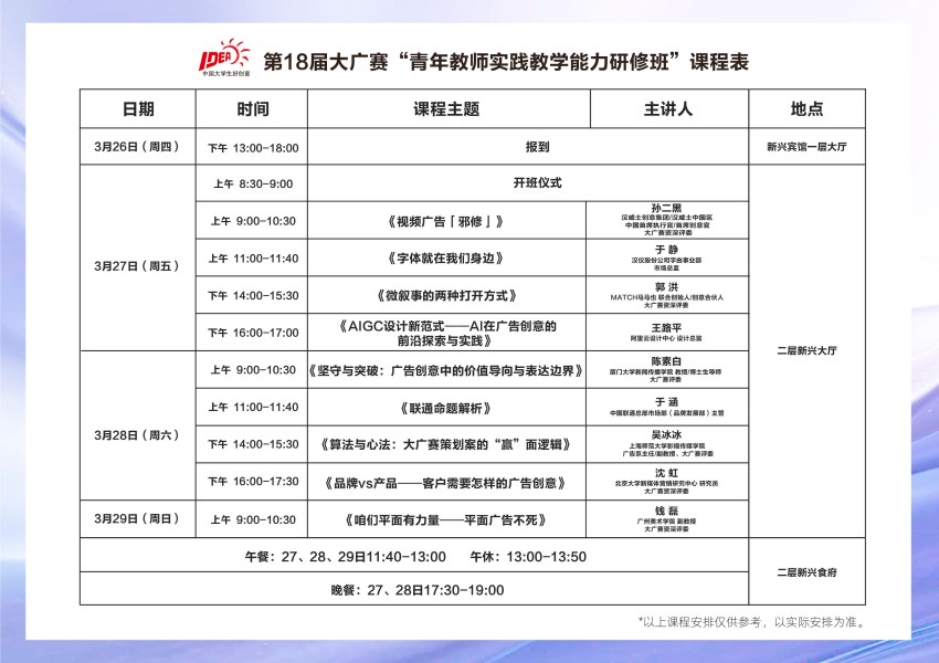 第18届大广赛“青年教师实践教学能力研修班”课程表公布啦!