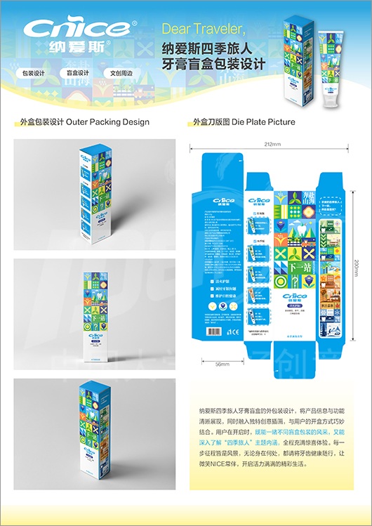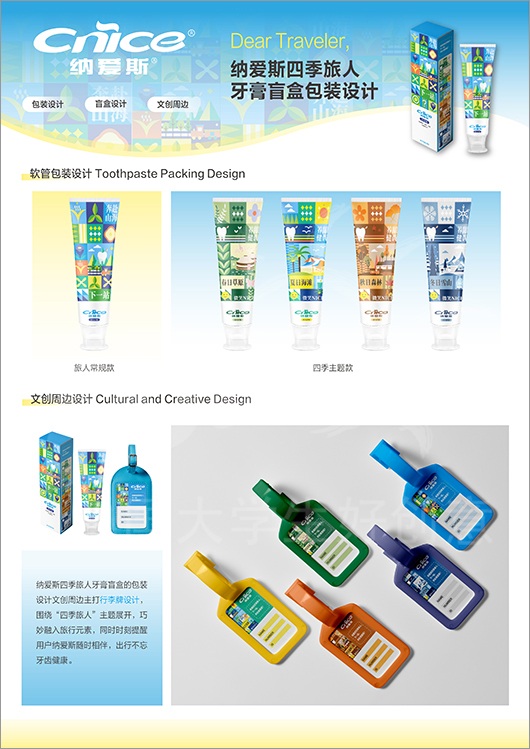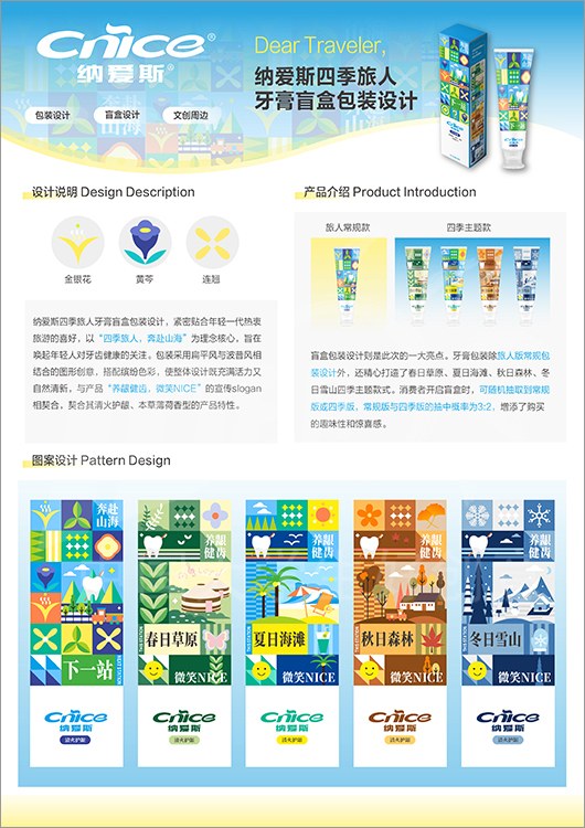 命题名称:10 纳爱斯 参赛编号:Ab10-10-003-0001 作品名称:四季旅人:纳爱斯牙膏盲盒设计