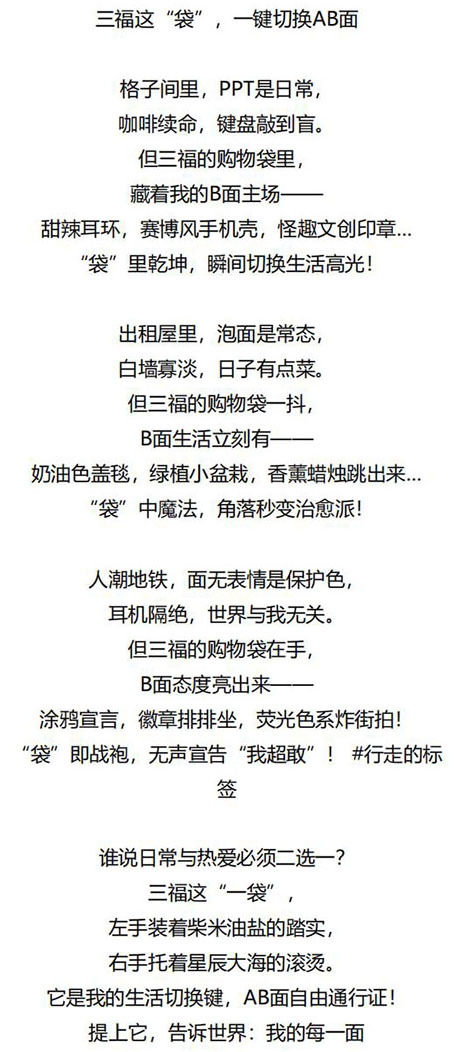 命题名称:07 SANFU三福 参赛编号:G07-18-037-0083 作品名称:三福这"袋",一键切换AB面