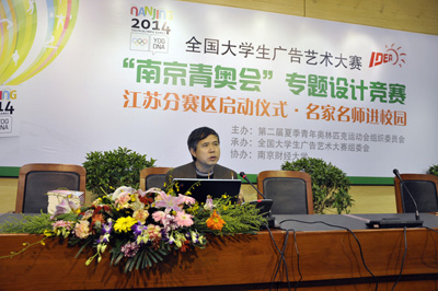 3月24日下午,全国大学生广告艺术大赛“南京青奥会”专题设计竞赛江苏分赛区启动仪式暨名家名师进校园活动在南京财经大学仙林校区图书馆报告厅举行。此次活动由第二届夏季青年奥林匹克运动会组织委员会主办,全国大学生广告艺术大赛组委会承办,我校协办。校党委副书记、副校长王建明,奥运会吉祥物设计主创之一、残奥会吉祥物设计者、清华大学美术学院设计部主任吴冠英教授,国际平面设计联盟AGI会员、中国美术家协会会员、南京艺术学院设计学院博士生导师曹方及组委会相关负责人出席了启动仪式。来自江苏分赛区的30所参赛院校的师生代表参加了启动仪式。