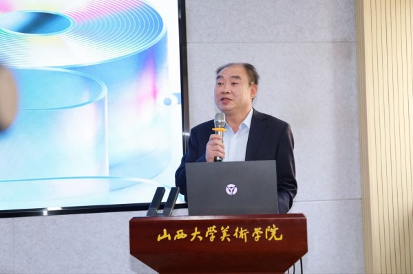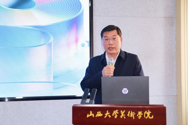 山西大学美术学院院长刘维东教授代表承办单位致辞。刘维东院长结合本届大广赛“创意赋新章”主题口号,对学子提出三点期望:深入生活、勇于跨界、精益求精,并希望指导教师以赛促教、以赛促改、以赛促研,充分激发学生的创新潜能,以高质量参赛作品展现当代青年积极向上的创意风采。
