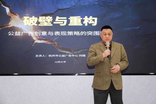 杭州市公益广告智库专家、中国广告协会学术与教育委员会常委刘强教授带来《公益广告的创意与表现策略分析》的主题讲座。以交互、场景、共情、融合四大关键词为核心,从创作逻辑、情感表达与传播策略等维度,结合经典案例拆解公益广告创作密码,引导学子们以创意传递温度、用作品践行社会责任,在公益创作中实现青春价值。