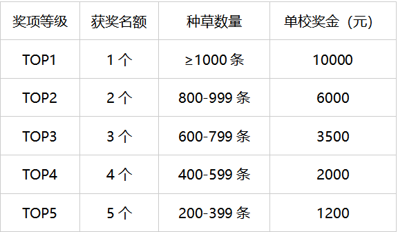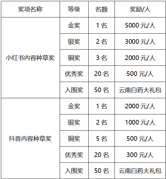 奖项设定: 注明:【优秀赛区组织奖】和【优秀学校组织奖】特别规则说明 1.顺延规则:若同一奖项等级内出现多个种草数量相同的情况,将按照种草数量从高到低顺延确定获奖名额,超出名额部分自动纳入下一等级评选; 2.空缺递补规则:若某一奖项等级(含TOP1)出现名额空缺,将按等额奖金增补至下一等级的获奖名额; 3.领奖限制:赛区与学校奖项不可重复领奖,作品以学校为单位参与评选后,不得再报送至赛区参与评选。 三、个人种草传播奖 1.小红书种草传播奖 参与方式:参与第18届大广赛,且在小红书平台发布并带话题#云南白药光钻白牙膏 #护口有方,钻白闪耀 #第18届大广赛,并@云南白药个护。评审团将会从所有内容中选取优质种草内容,颁发作品奖。 2.抖音种草传播奖 参与方式:参与第18届大广赛,且在抖音平台发布并带话题#云南白药光钻白牙膏 #护口有方,钻白闪耀 #第18届大广赛,并且@云南白药个人护理旗舰店。评审团将会从所有内容中选取优质种草内容,颁发作品奖。
